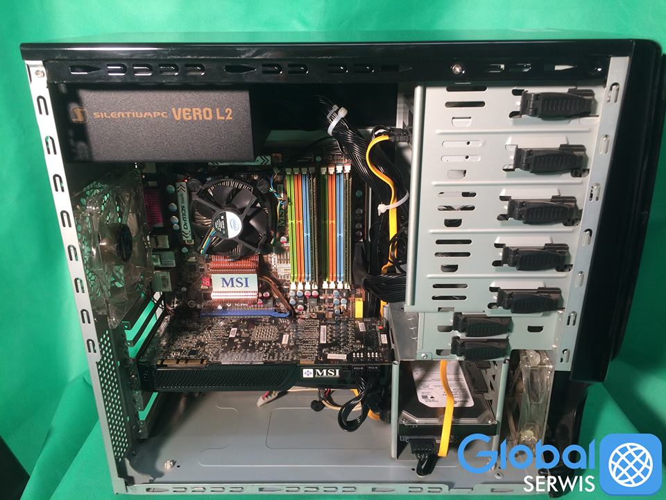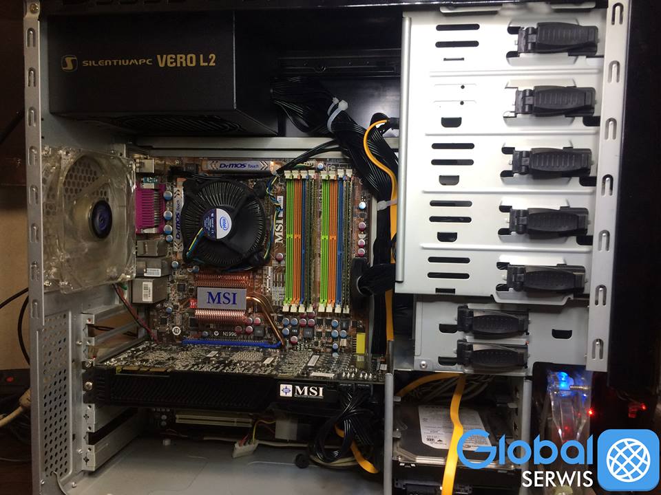Naprawa polegała na dokładnym oczyszczeniu całej jednostki, wymianie pasty termo-przewodzącej, oraz wymianie zasilacza i poukładaniu okablowania w obudowie.